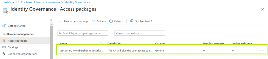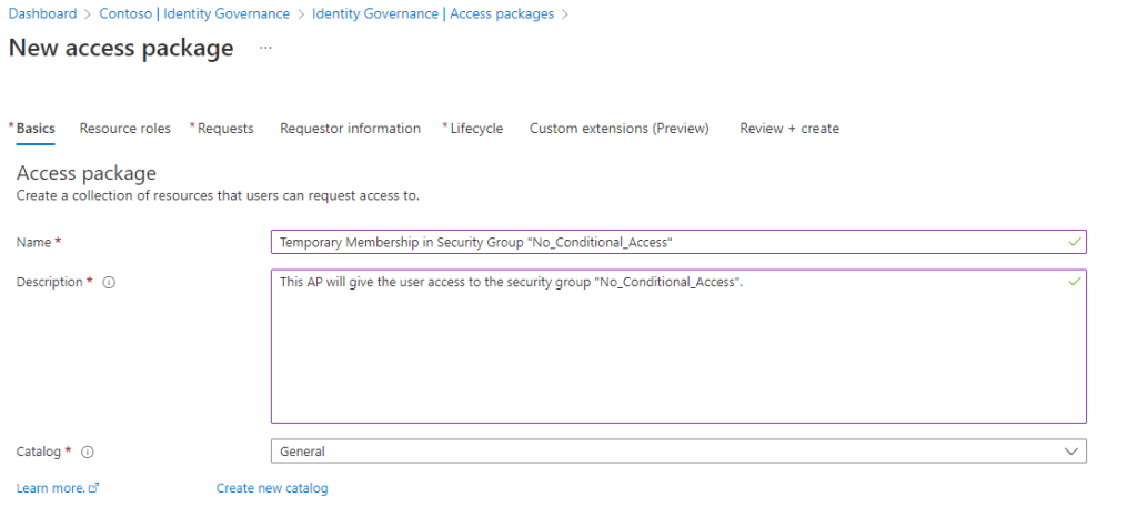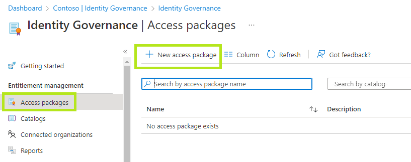 Head over to the Identity Governance pane and select „Access packages“ followed by „New access package“: