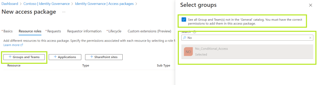 Select „Groups and Teams“ to add a group, then check „See all Group and Team(s)“ and select the desired group: In my case „No_Conditional_Access“.
