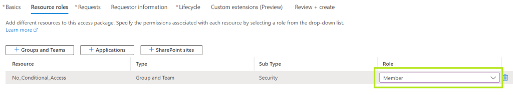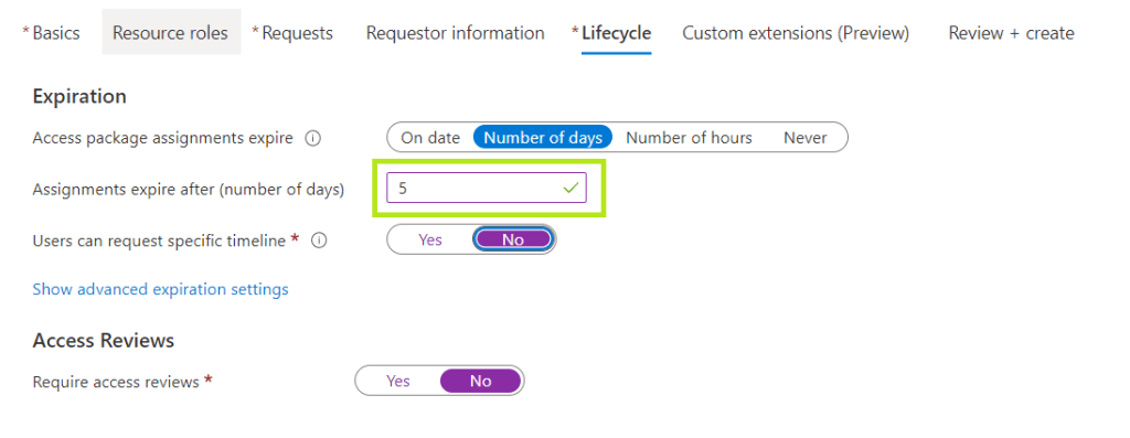 The expiration settings are really self explaining. I went for a specific number of days (5 in my case), the specific timeline does not matter (as admins are assigning the access package) and so does the requirement for access reviews.